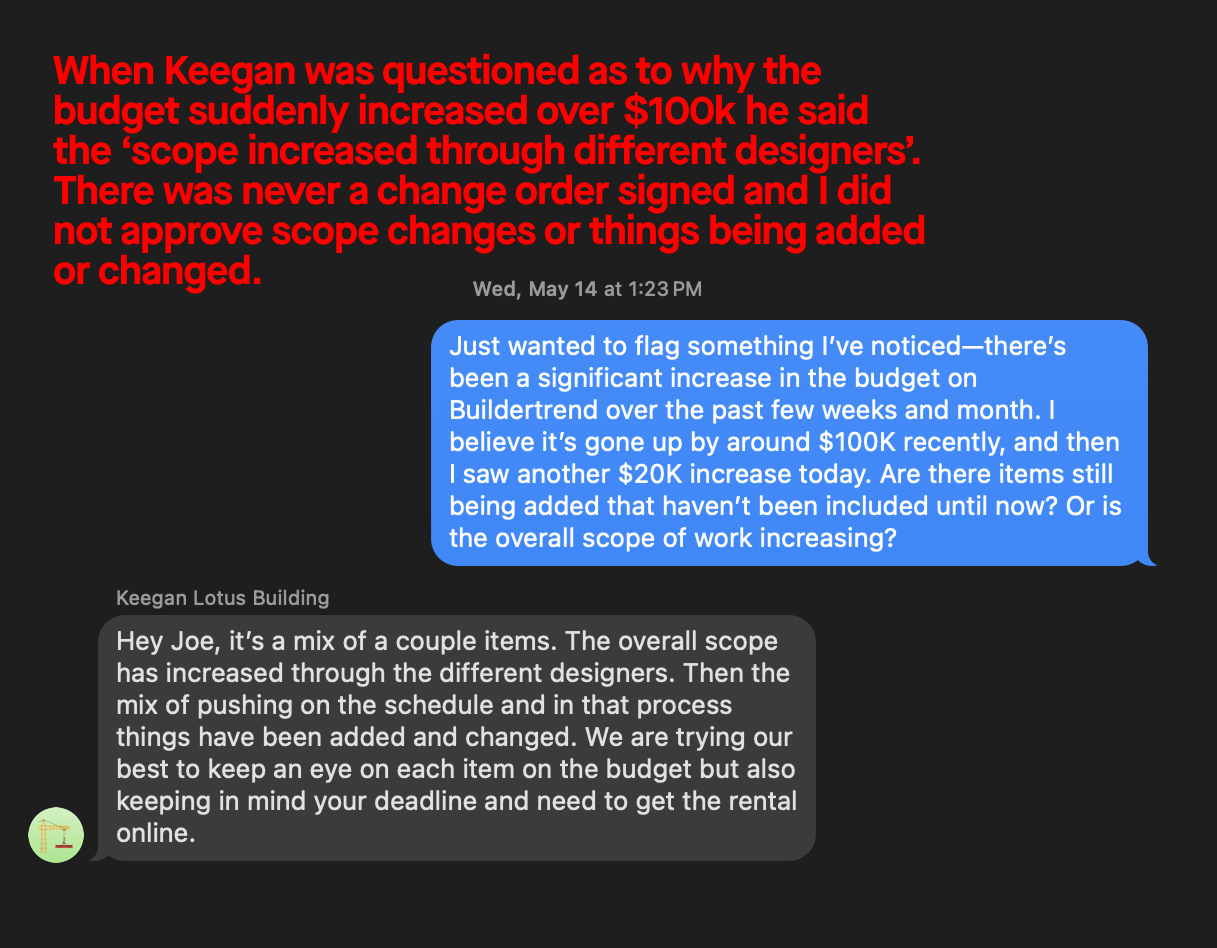 My Response: While they used BuilderTrend, I repeatedly emailed them reminding them to finalize budgets and line items. Everything was “finalized” until suddenly it wasn’t — when they arbitrarily raised costs by $500,000 in the last month.