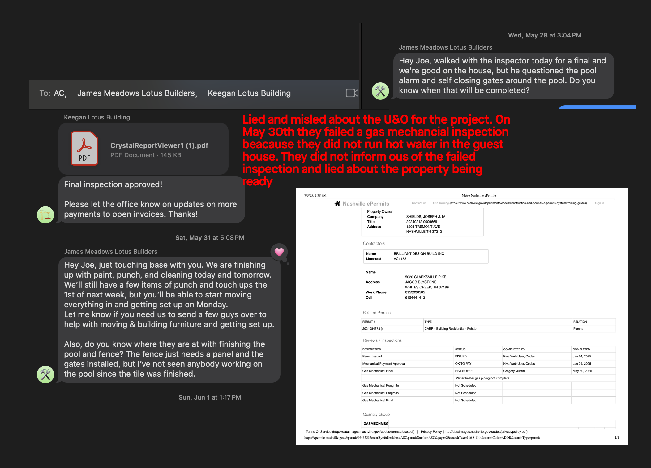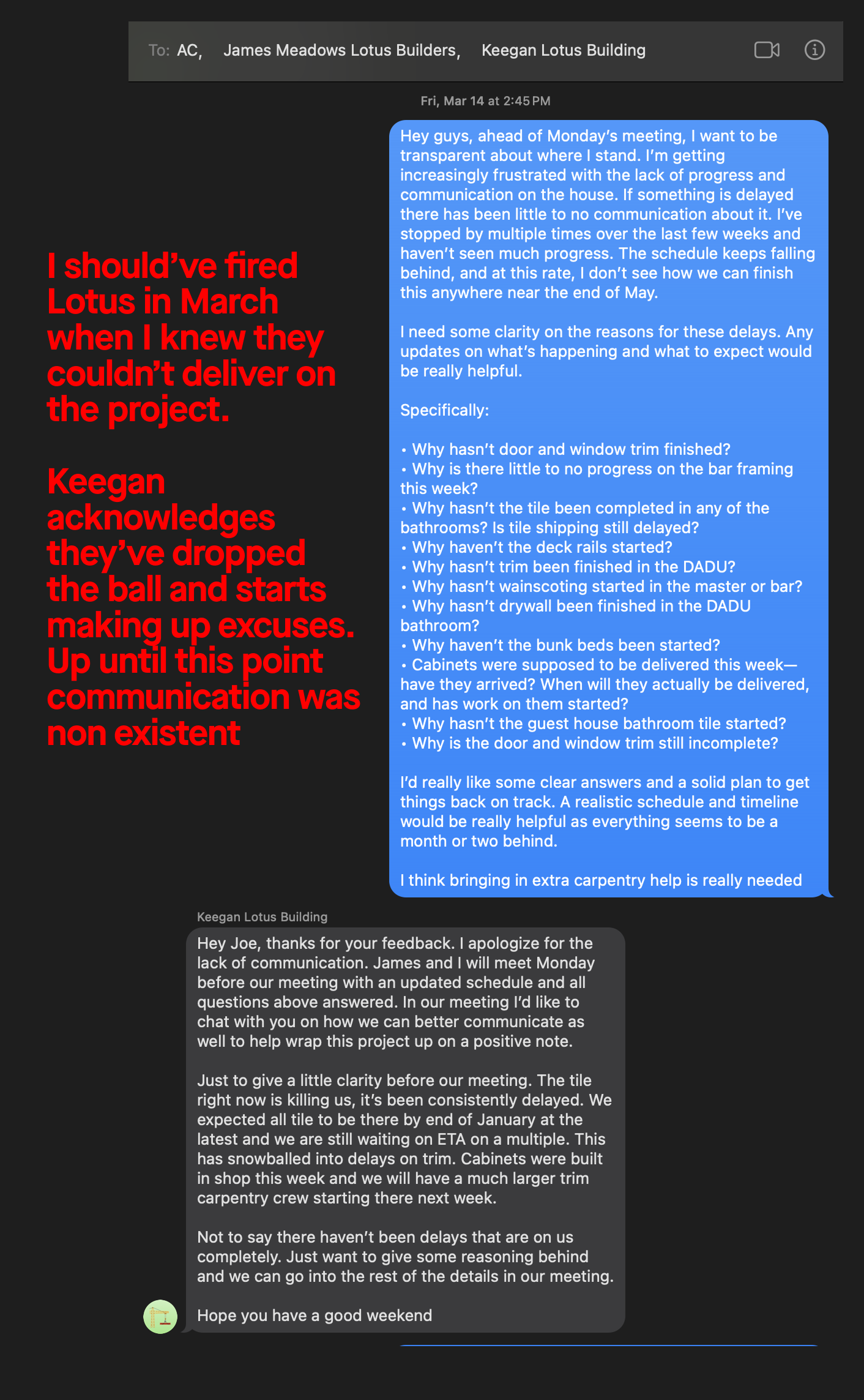 By March, things were so bad we tried to fire Lotus. That decision is fully documented in emails and texts. In response, they canceled the contract themselves and walked off the job — no final walkthrough, no resolution, no accountability. They left us with an unfinished, unsafe property and enormous financial harm.