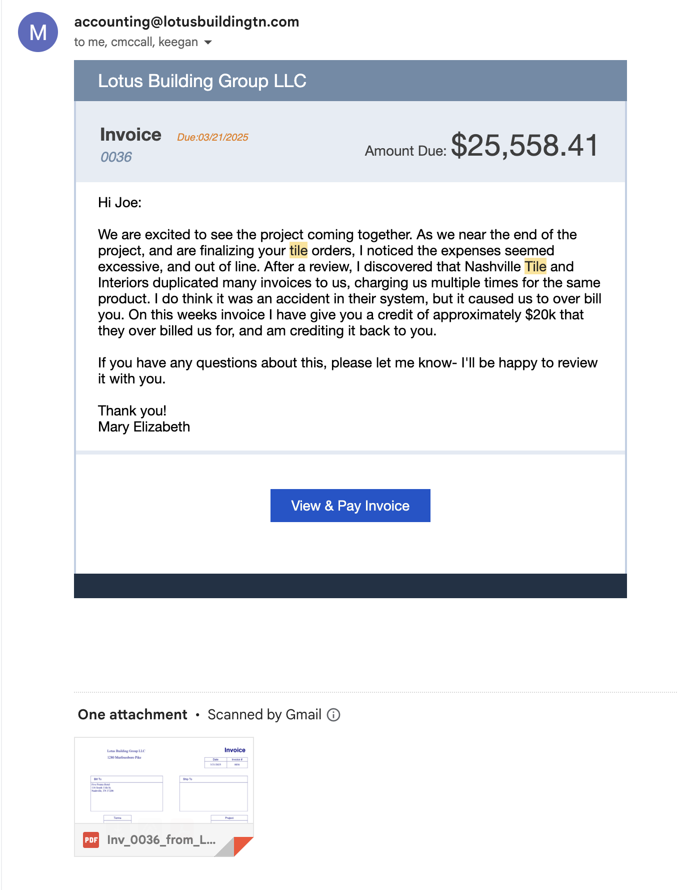 Then, in the final 30 days, Lotus dropped a bombshell: over $500,000 in additional charges appeared out of nowhere. There were no meetings, no notes, no texts, no emails, no signed approvals — nothing. Just surprise invoices that pushed the job nearly 65% over budget.