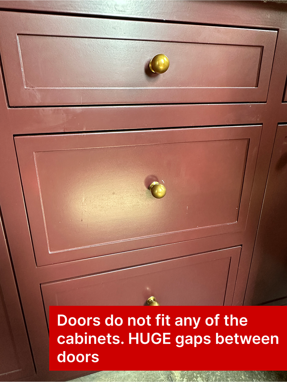 Cabinet doors weren’t sized correctly, leaving interior shelves exposed.
