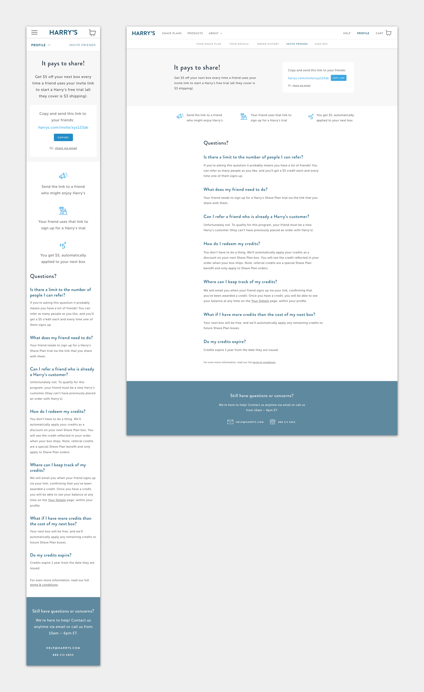 With a clear design direction in hand, we quickly put together visual comps to build an InVision prototype and run user tests. We brought in eight different Harry’s customers and had them use the prototypes on both mobile and desktop. The test tasks consisted of the user receiving an email notifying them of the program, and us then asking them questions to gauge their comprehension of the referral program based on the email. They were then tasked with clicking through to the referral program overview page and tasked with reviewing the FAQ and then copying and sharing the referral link. Our tasks and questions in this part of the test focused on the clarity of the overview page and the ease of copying and sharing the URL link and using the email this link button.